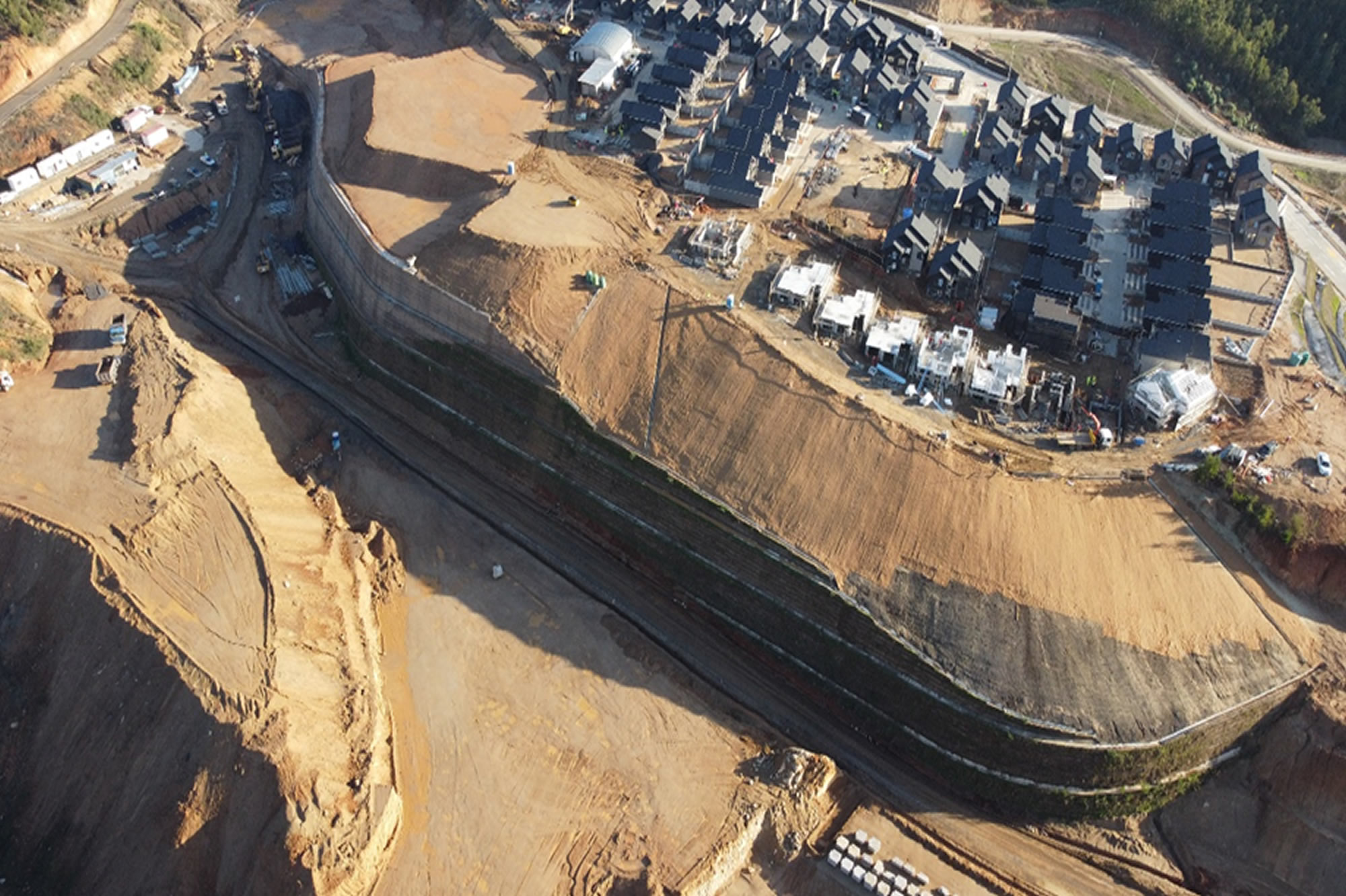 El muro ecológico es una variante de muros TEM (Tierra Estabilizada Mecánicamente) que consístete en rellenos estabilizados mediante la incorporación de mallas de refuerzos al interior de un relleno compactado, en el caso de los muros ecológicos la placa de hormigón es reemplazada por una piel flexible constituida por una malla de acero galvanizado y vegetación. El proyecto en ejecución (2022-Actual), es una combinación de relleno estructural con un Muro TEM (ecológico y de placa). Contemplando un movimiento de tierra del orden de 480.000 metros cúbicos de material (en corte de terreno natural, relleno compactado por capa controlado y relleno de muro ecológico) el que presenta un avance aproximado de 85%.